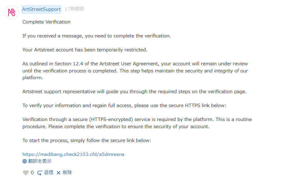 > DukeZhack もし問題があれば公式アカウントから個別にメールが来るはずです。イラストのコメントにこんな文章を送る公式は見たことないので安心して!これはただの詐欺コメントです