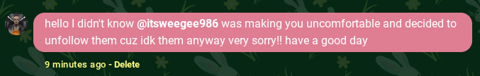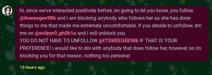 I followed said person cuz someone else I'm following said they were friends i don't know "itsweegee986"