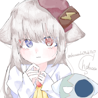 眠ったるそうな、でも神秘的で何かを秘めていそうなおめめと青緑のメッシュが入った髪などラトちゃんの素敵な特徴をどう活かそうか考えた結果…目を逸らし困り眉で恥ずかしがる照れ顔ということに落ち着きました。我ながら大天才😇😇✌(???)